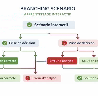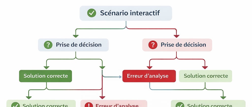 Les branching scenarios permettent de simuler ces situations professionnelles dans un environnement pédagogique.
